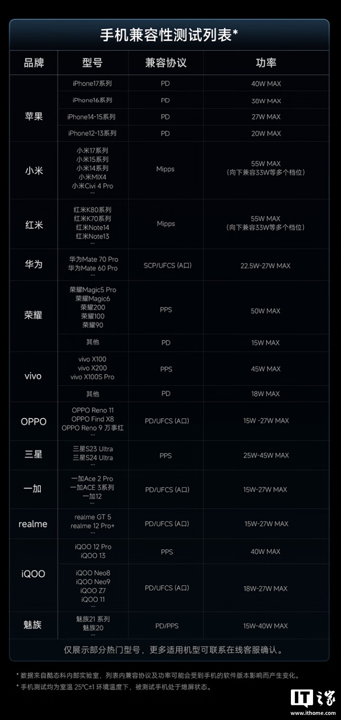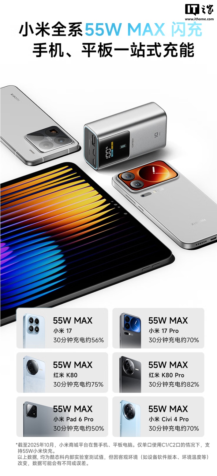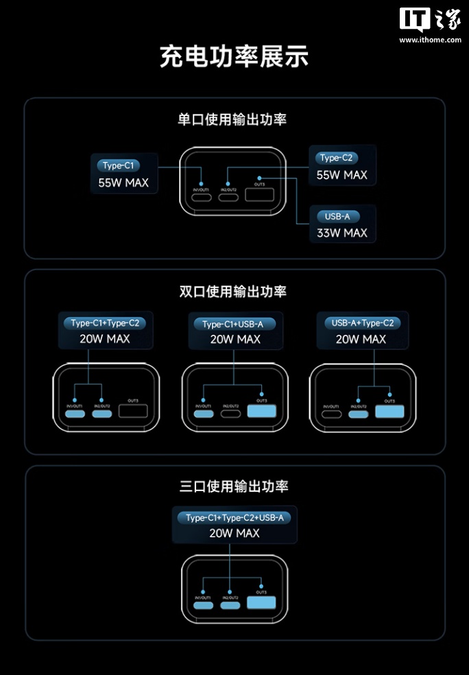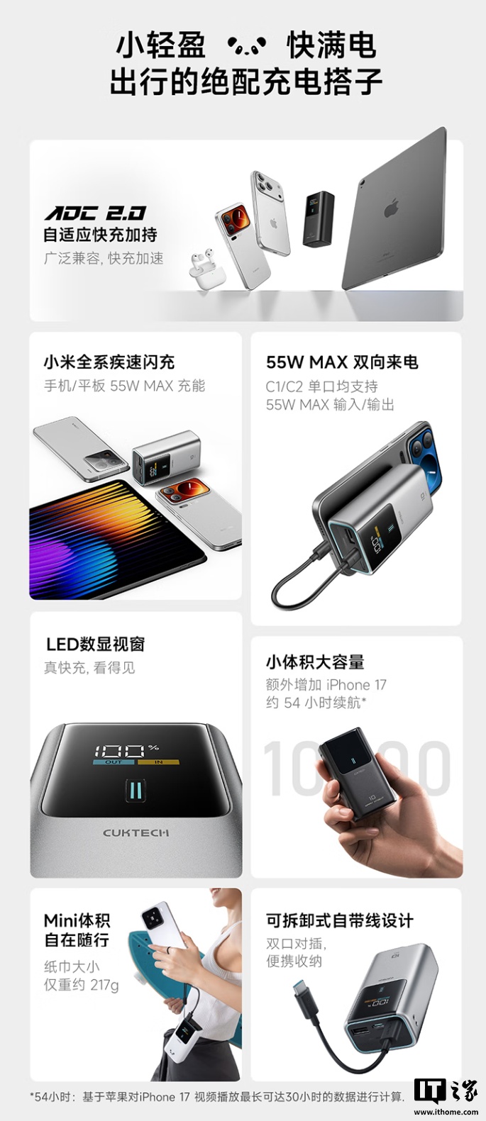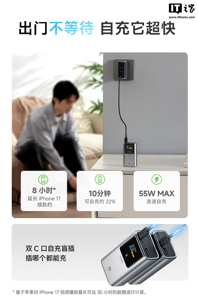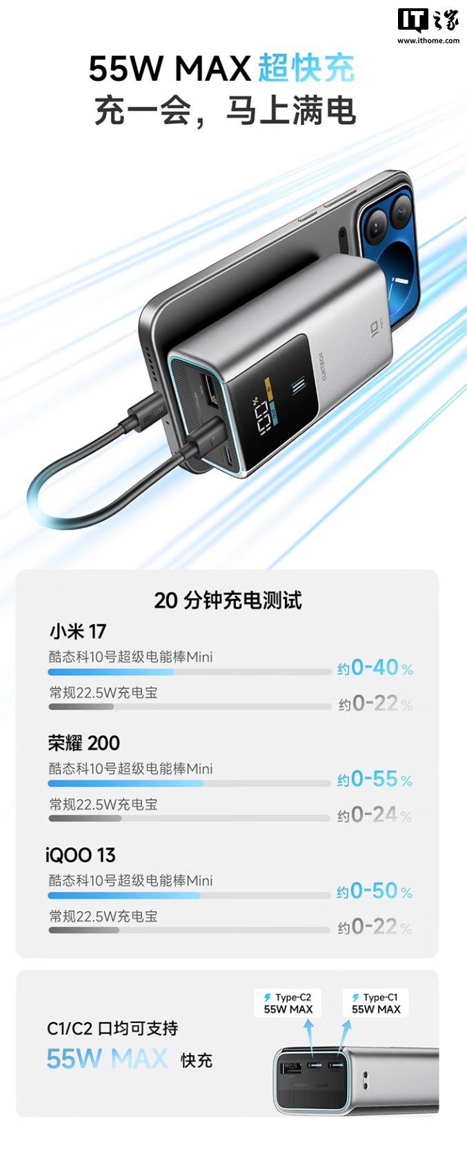参数方面,这款充电宝支持 55W Max 超快充,可在 20 分钟内给小米 17 充入 40% 电量,C1/C2 口均支持 55W Max 快充,兼容 PD、PPS、MiPPS、UFCS 融合快充、华为 SCP 等多种协议,支持多品牌手机、笔记本电脑、游戏机,小编用小米 14 实测能激活 55W 银标快充。