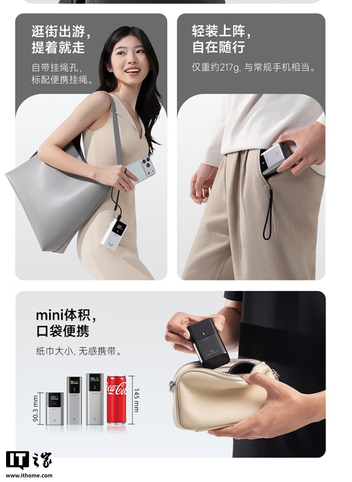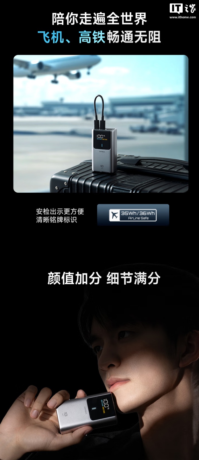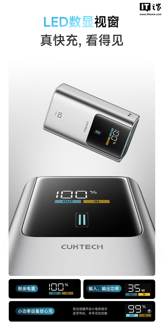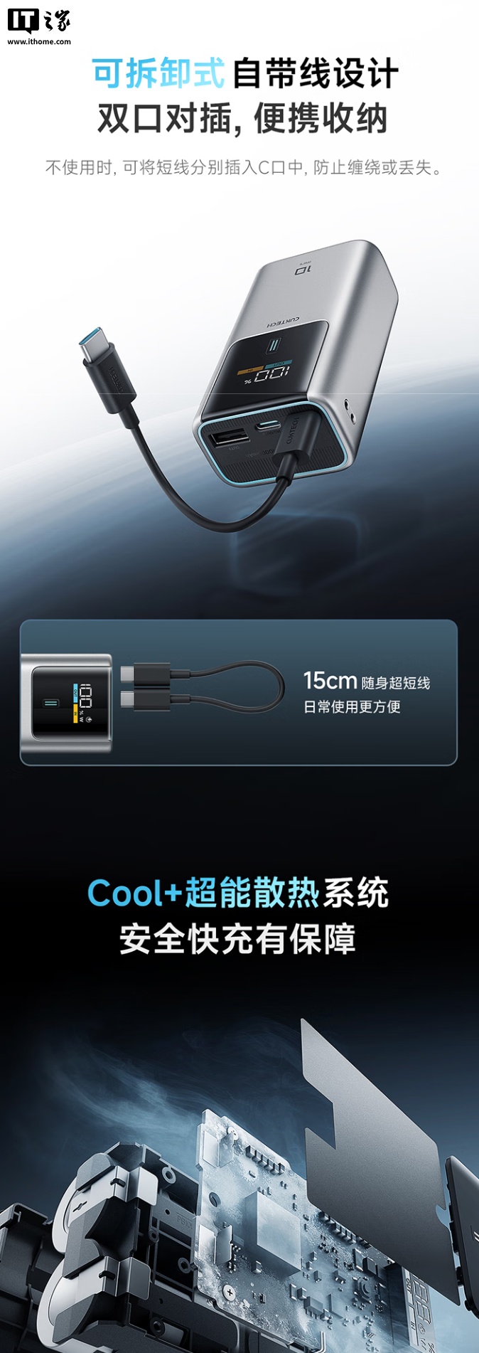 此外,这款充电宝还有一块 LED 数显,可显示剩余电量、输入 / 输出功率等,支持 55W 急速自充,可在 10 分钟内充入 22% 电量,自带一根 15cm 短线,可以将线的两个 TypeC 口都插入机身 C 口当作挂绳使用。